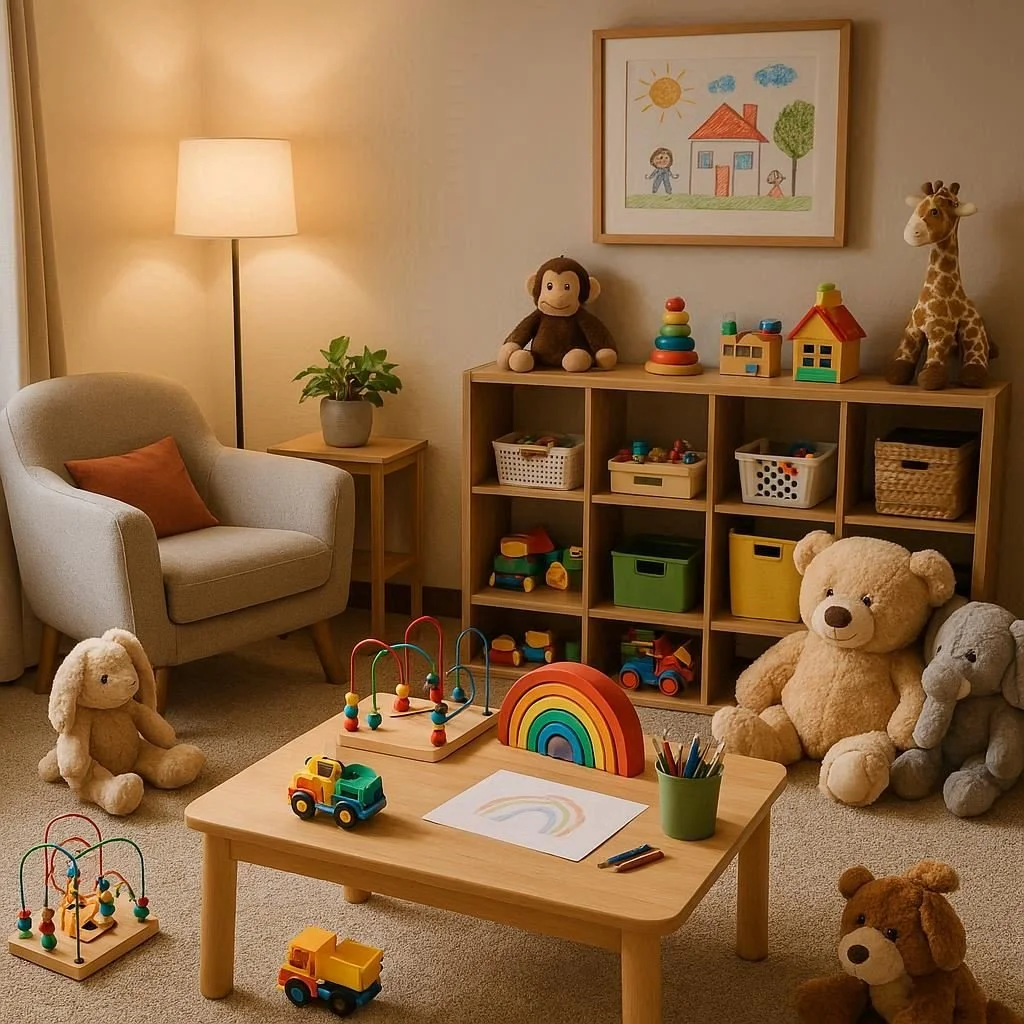 Our play therapy space uses structured, evidence-based techniques to help clients explore emotions, develop coping skills, and process experiences in a safe, supportive environment. Research shows that play therapy can reduce anxiety, improve emotional regulation, and strengthen social and cognitive development, making it a powerful tool for both children and adults to build resilience and foster mental well-being.